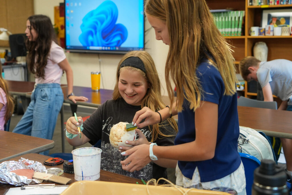Students researched the ancient civilizations they read about over the summer and then entered the next phase of their project – constructing an artifact that could relate to that time period. Working in groups, they brought their theoretical discoveries to life using paper mache, cardboard, hot glue, and dirt! They then wrote backstories for their creations that would help lead archeologists from other groups to their hidden treasures.
